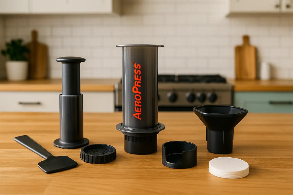 Most Aeropress kits include a stirrer paddle (designed not to damage the filter), a coffee scoop (about 14-15g), and a funnel (useful for loading grounds or brewing into narrow mugs).